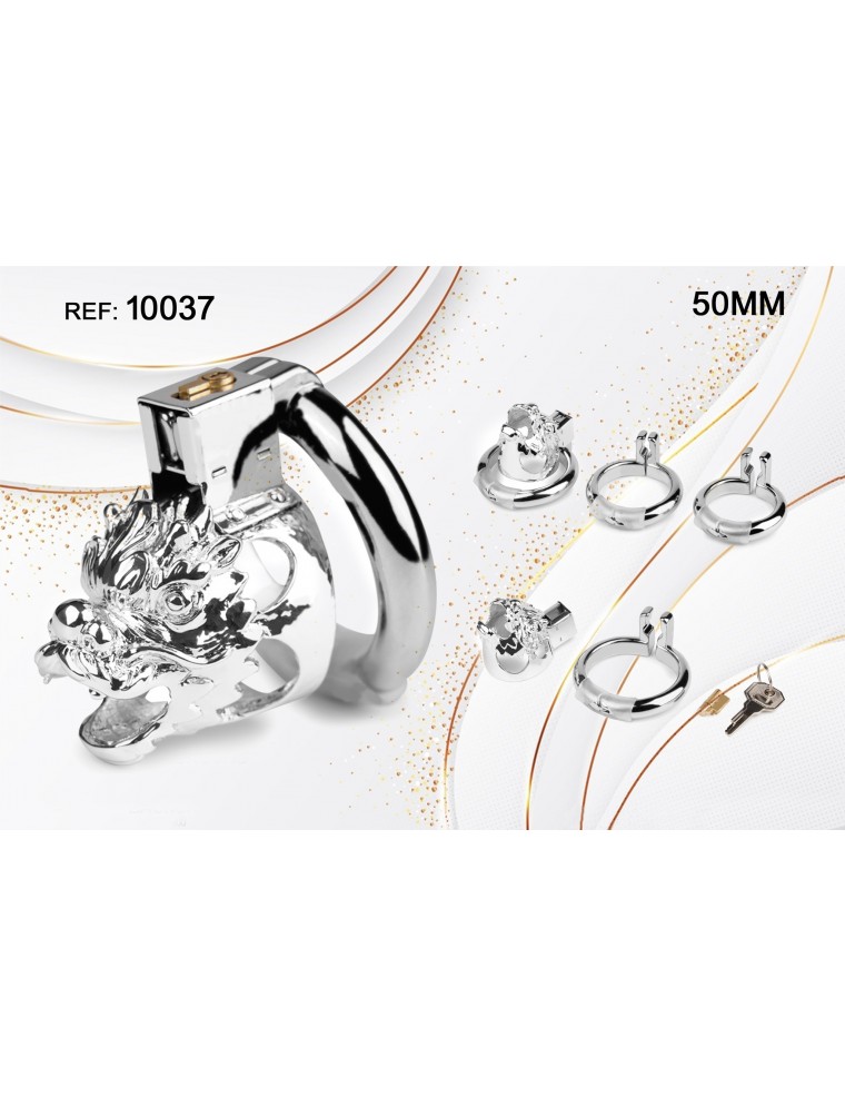 Jaula de castidad masculina metálica, con dos anillos de sujeción y candado. Perfecto para vivir noches de BDSM sin límite.